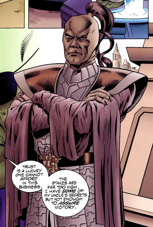Vous savez déjà que Nialye Telrone est la fille de Dragan Telrone, riche fortune corellienne et ancien Sénateur de Corellia (avant ou après Bel Iblis ?). Elle est marrié à cal Podigno qui est réputé très proche du pouvoir actuel de la Nouvelle République et de la Presidente, Leia Organa-Solo, en particulier. Est-ce son cas également ? Si oui, que fait-elle aux côtés de Borsk Fey'lya qui est officiellement plutôt opposé à Mon Mothma (qui a pris sa retraite) et à Leia Organa-Solo (qui lui a succédé) ?