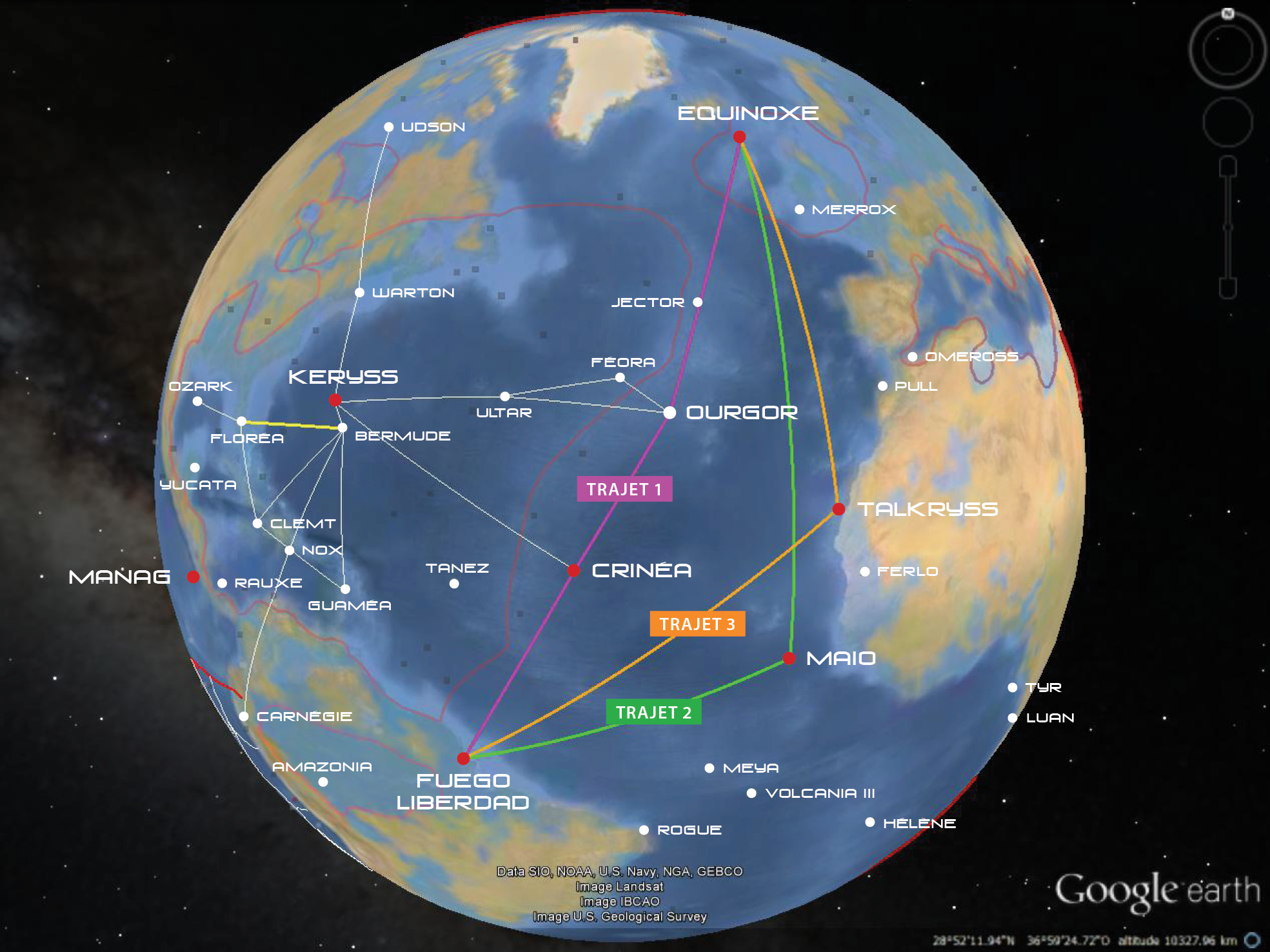 Ilon a établi 3 routes potentielles pour rallier Fuego Liberdad depuis Equinoxe. Voici le résultat de ses calculs, carte à l'appui :