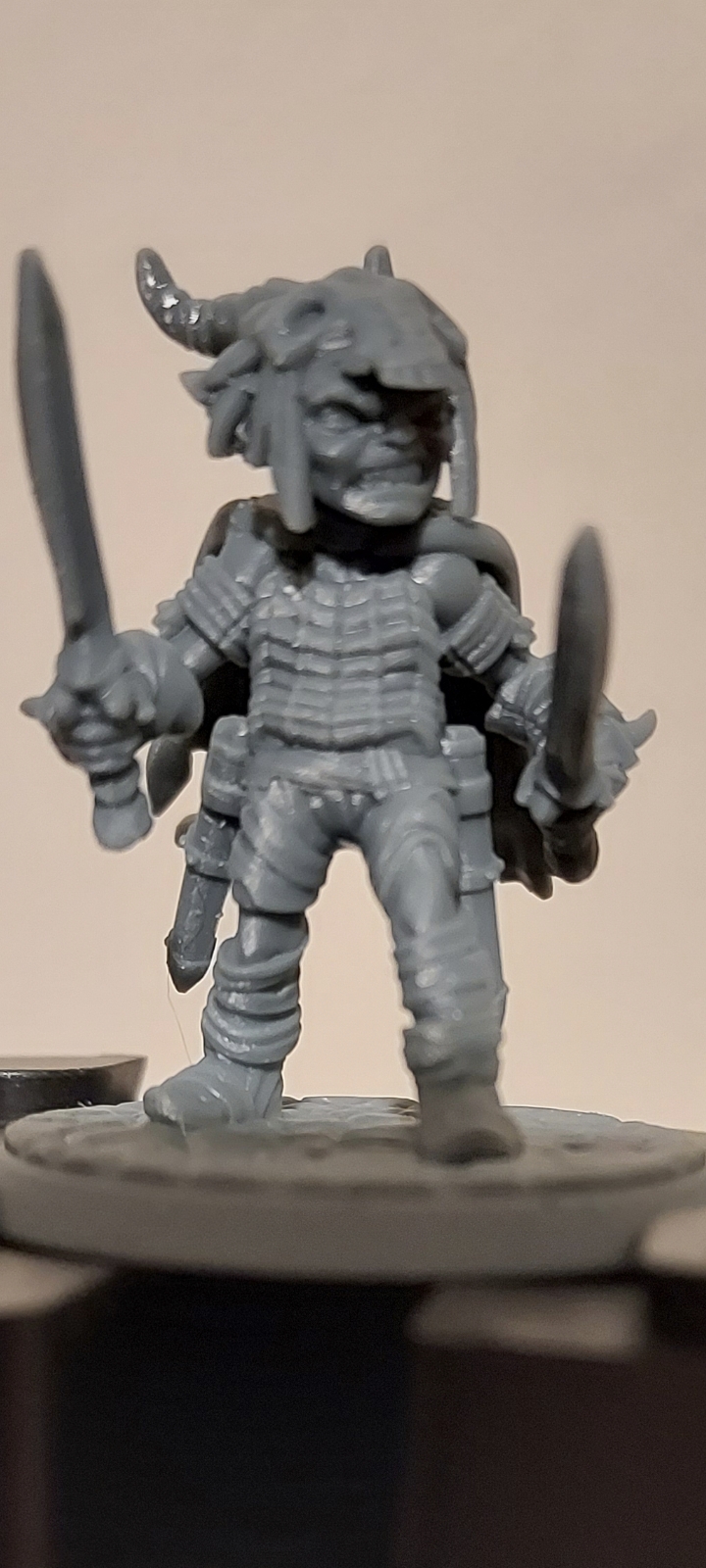 En rentrant chez moi, ma petite commande de figurine test m'attendait. Je lui donne la note de 4/5 en moyenne. La qualité de la figurine me semble légèrement moins "nette" que les figurines imprimées chez Heroforge : les reliefs me semblent par exemple un peu moins marqués. Mais le rapport qualité/prix est bien meilleur qu'avec une commande Heroforge. Avec le prix du fichier d'impression 3D à 7 euros plus les 3,5 euros de l'impression elle-même, 10,5 euros pour une figurine personnalisée c'est pas cher.