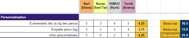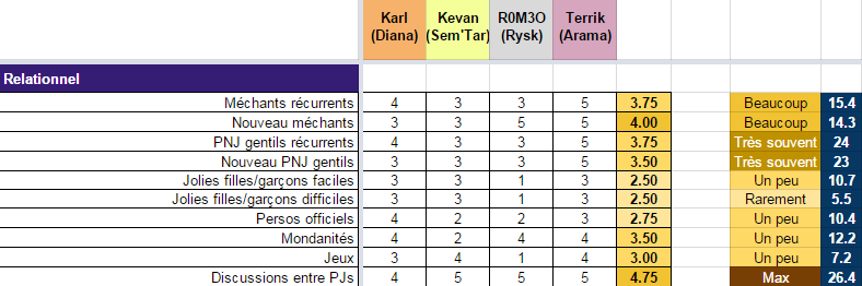 Sans surprise, le PJ le plus "compliqué" fut Terrik/Arama avec une moyenne de 2 compli par partie tout rond.