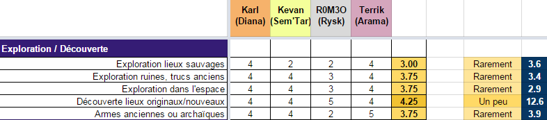 Au début de la campagne, j'avais identifié des grandes thématiques de jeu, plus ou moins liées à Star Wars, sur laquelle je vous avais demandé à chacun de donner une sorte de niveau d'intérêt, de 1 (bof, ça m'intéresse) à 5 (carrément j'adore).